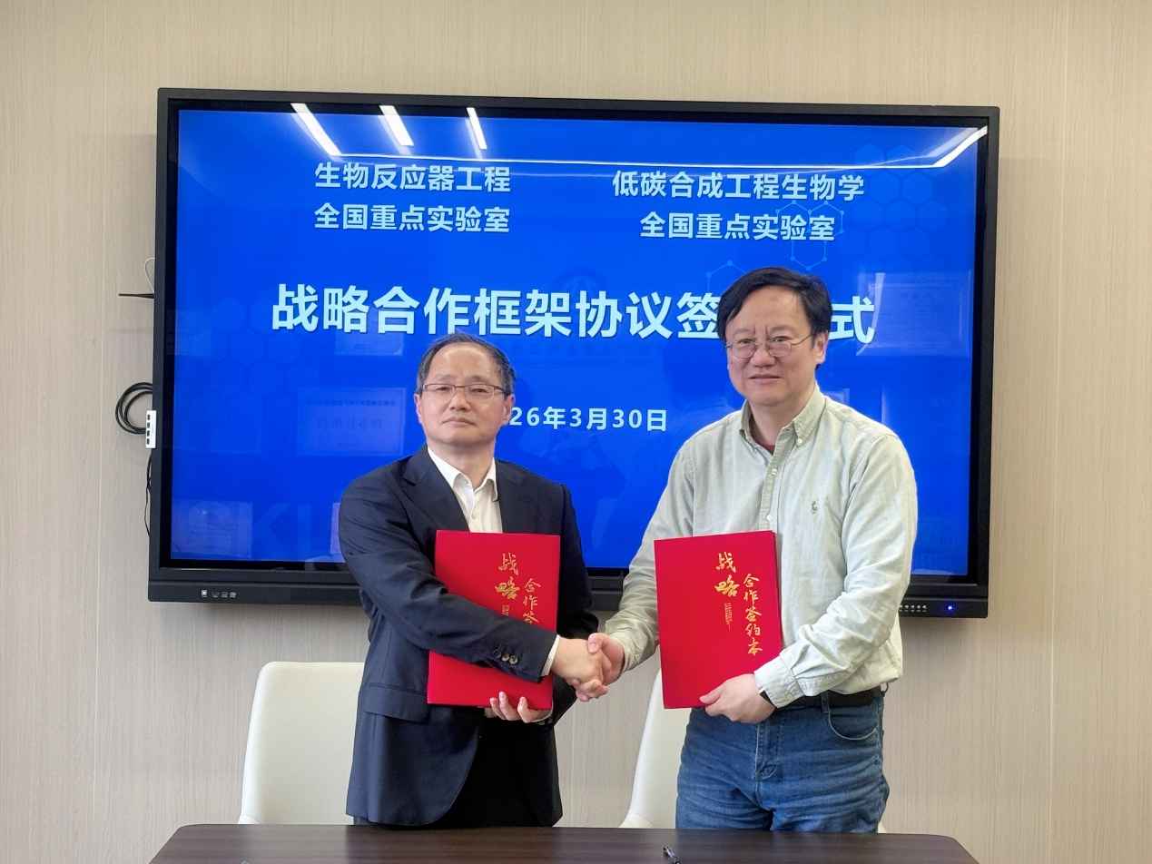 2026年3月30日,生物反应器工程全国重点实验室与低碳合成工程生物学全国重点实验室正式签署战略合作框架协议。生物反应器工程全国重点实验室主任叶邦策、低碳合成工程生物学全国重点实验室主任张以恒分别代表双方签字,标志着两大国家级科技创新平台进入深度协同、融合发展的新阶段。